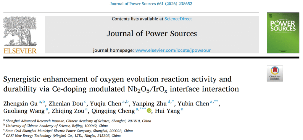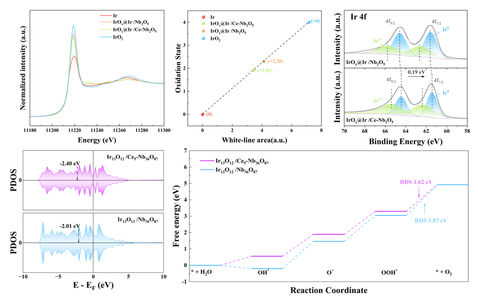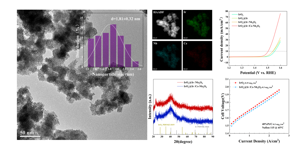 中科院上海高等研究院楊輝研究員團隊與寧波中科科創(chuàng)研發(fā)團隊通過在Nb2O5載體材料均勻引入微量Ce原子,并表面負載超小IrOx顆粒 (<2 nm),構建一種具備強“金屬氧化物-載體”相互作用的負載型Ir基催化劑(IrOx@Ir/Ce-Nb2O5)。于載體材料中進行Ce原子摻雜,既提升載體與活性中心間的電子轉移能力,同時保證Ir/IrOx活性材料的晶格完整性,避免催化活性快速衰減。該催化劑酸性析氧反應過電位僅275 mV@10 mA cm-2,并在膜電極實際工況下表現(xiàn)出良好的活性與穩(wěn)定性,正持續(xù)檢測低載量下的長周期壽命(0.3 mgIr?cm-2)。